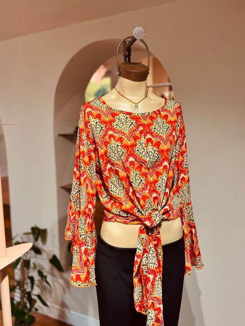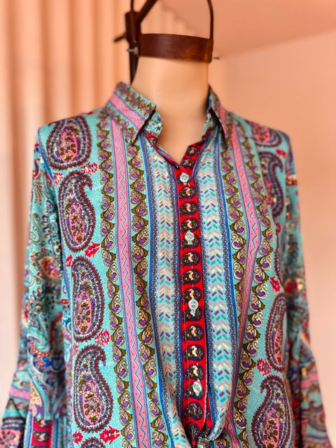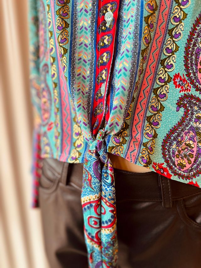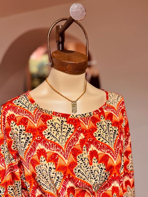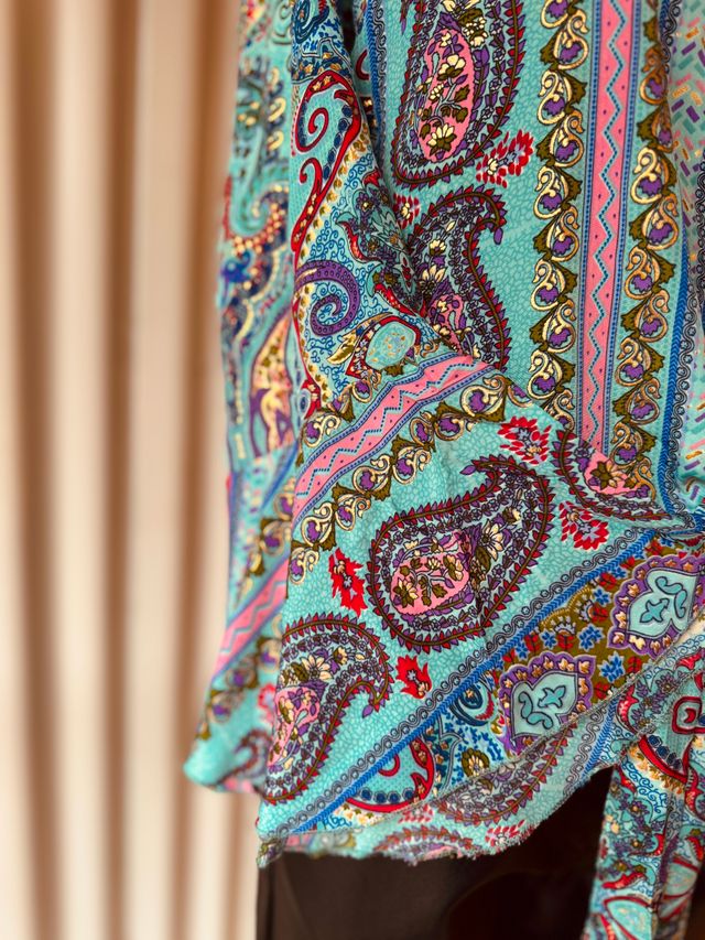 Una pieza única confeccionada en seda de la India, con un estampado en tonos vibrantes y detalles dorados que iluminan cada movimiento. Ver más detalles