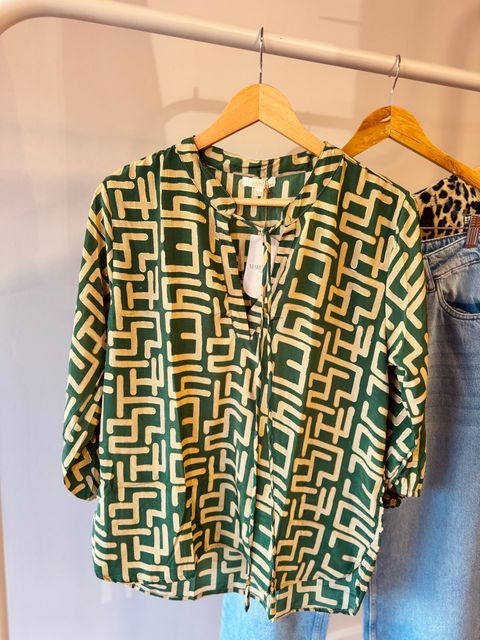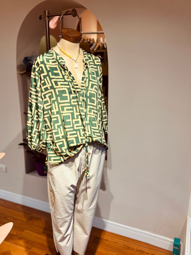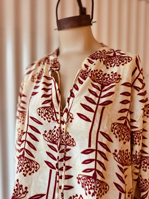 Blusa confeccionada en seda liviana con delicado acabado foil dorado que aporta un brillo sofisticado. Ver más detalles