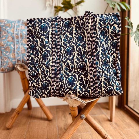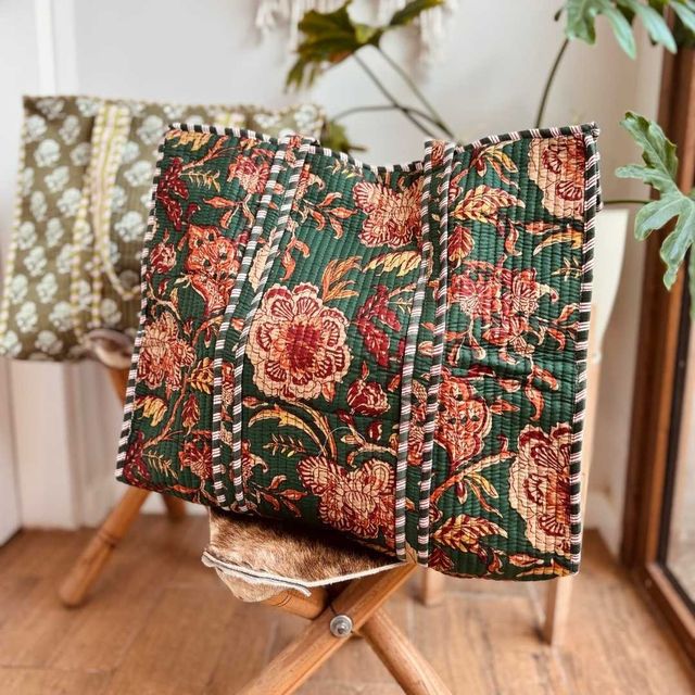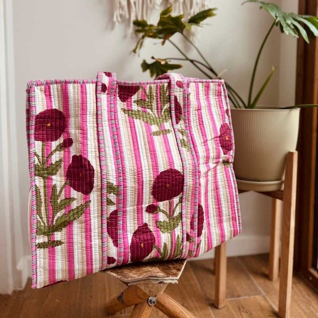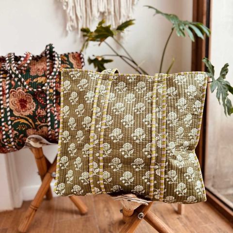 Este bolso 100 % algodón, confeccionado artesanalmente en la India, es práctico, liviano y lleno de estilo. Ver más detalles