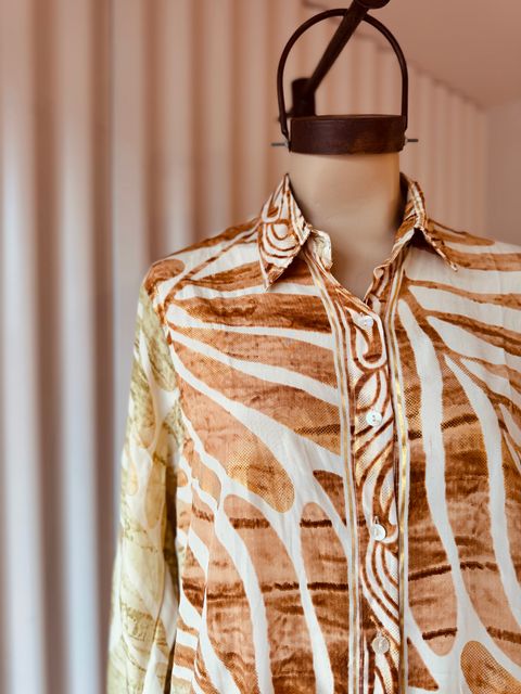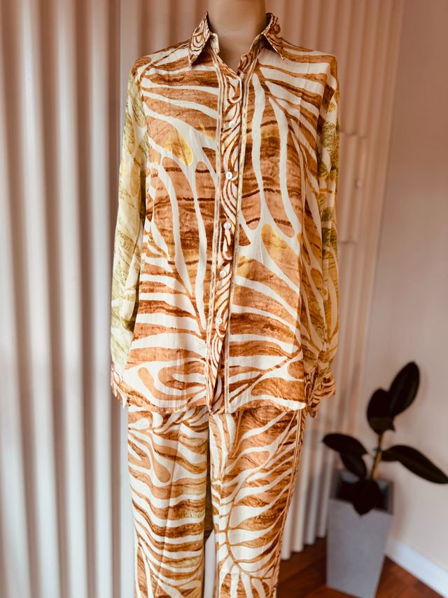 Camisa de seda tornasolada con estampado orgánico en tonos tierra, enriquecida con delicados toques de foil dorado. Ver más detalles