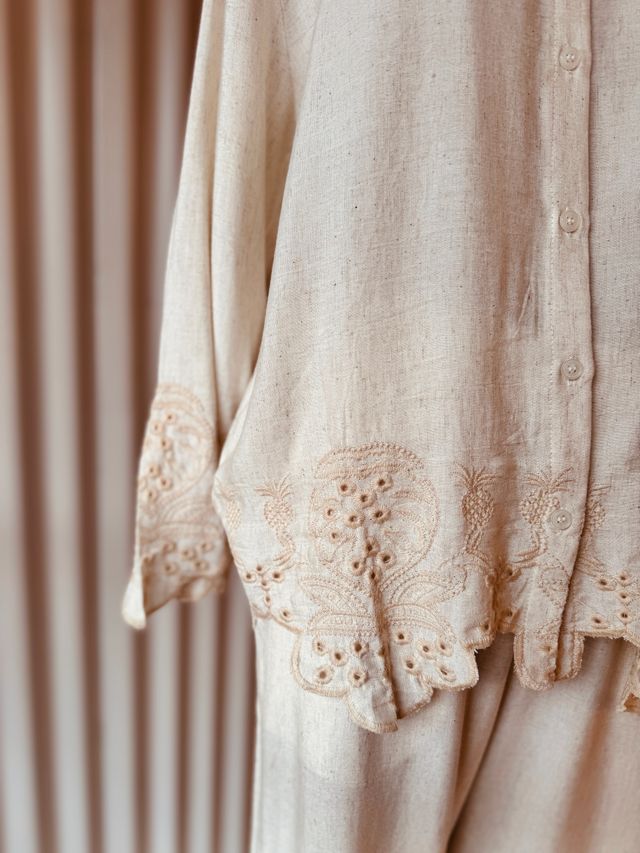 Presenta un delicado trabajo de bordado calado en el ruedo y en los puños, que se integra con terminaciones en ondas para aportar textura y feminidad. Los botones al tono mantienen la armonía del diseño, logrando un equilibrio entre lo sofisticado y lo artesanal.