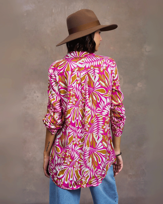 ✨ Un plus que amamos: los detalles dorados en contraste con la seda estampada hacen que combine perfecto con jeans clásicos o pantalones neutros, dejando que la camisa sea la protagonista.