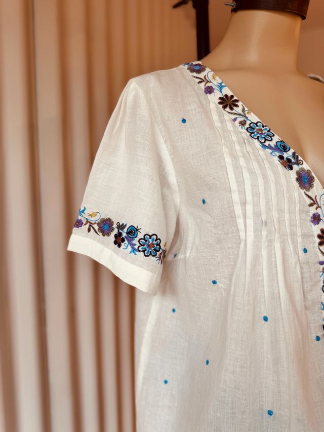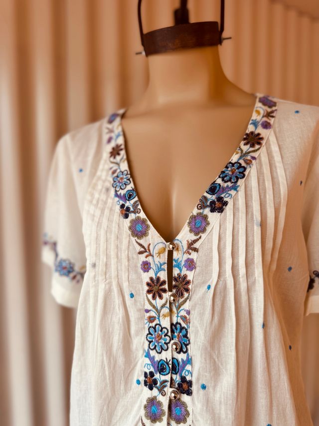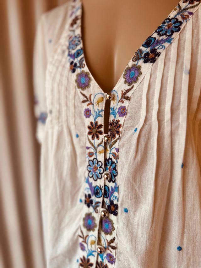Bordados florales en tonos azules y tierra, que recorren el escote, el frente y las mangas.