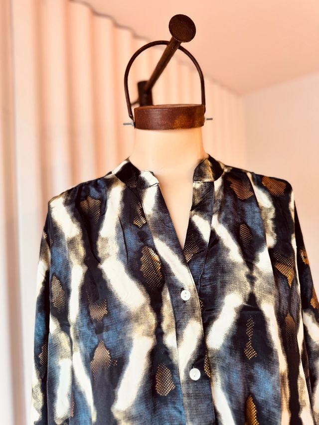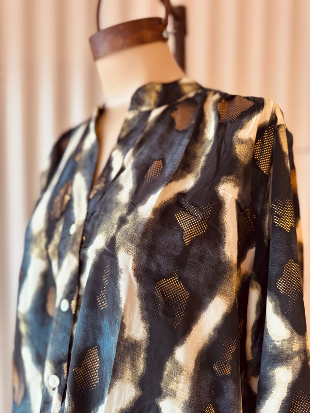 Camisa de seda con foil dorado. Una prenda que deslumbra con sutileza. Ver más detalles