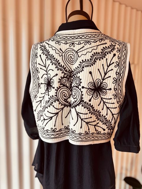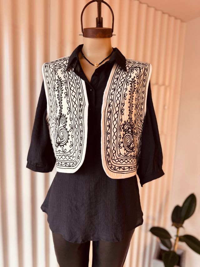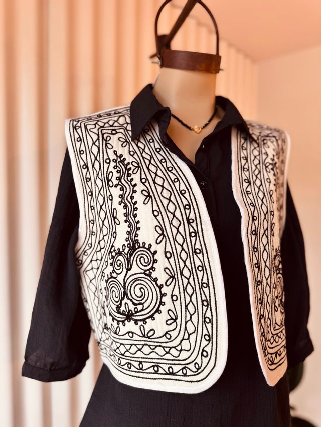 Este chaleco matelaseado blanco, confeccionado artesanalmente en la India, combina simplicidad y carácter en una prenda liviana pero impactante. Ver más detalles