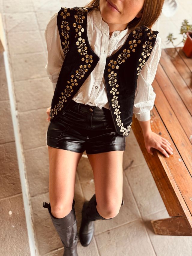Elevá tus outfits con este chaleco de terciopelo suave y con cuerpo, una prenda que combina elegancia y estilo bohemio. Ver más detalles