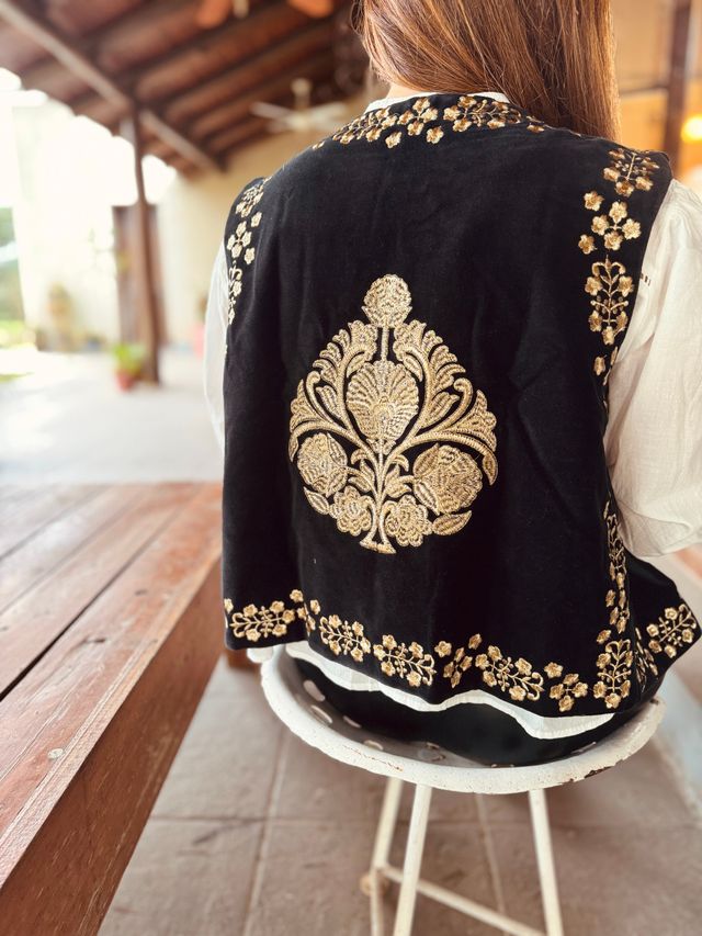 Está bordado a mano en el frente y en la espalda con un diseño único y lleno de detalles, que lo convierten en una verdadera obra textil.