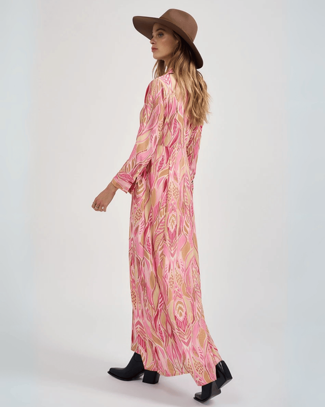 Vestido camisero largo de seda de sari, con mangas largas y caída liviana. Cada pieza es única porque la estampa varía. Confeccionado en India. Ver más detalles