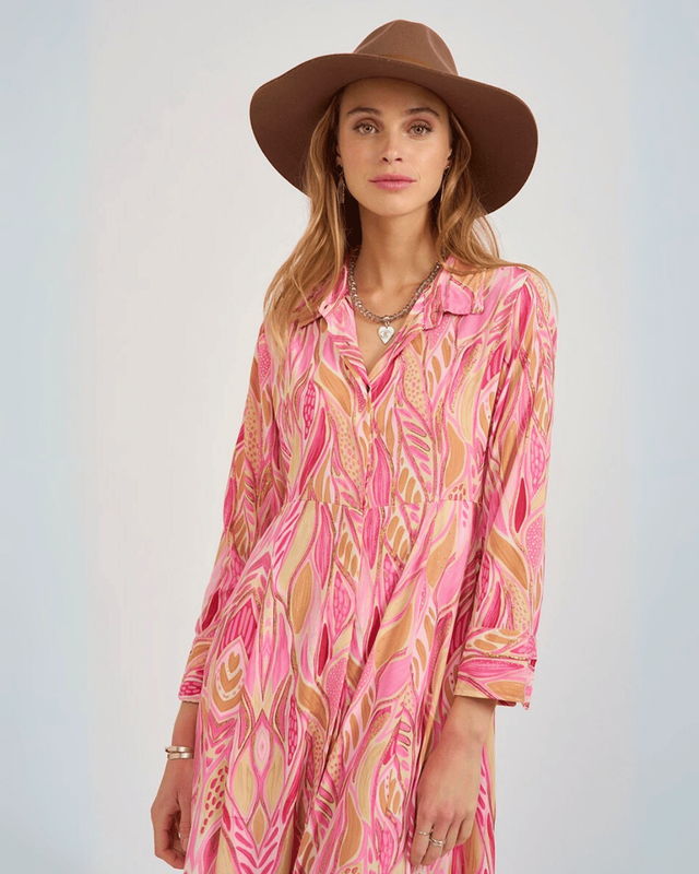 Un clásico con mucha onda: vestido camisero largo, de mangas largas, confeccionado con seda de sari original.