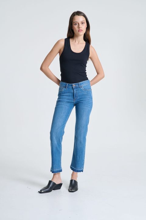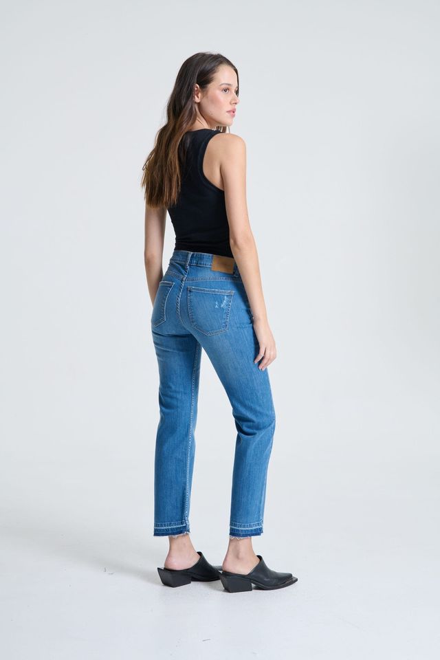 El lavado es azul medio, con roturas que le dan un estilo mas canchero, tiene el ruedo descosido. El largo ideal es al tobillo. Este jean es ideal que te lo compres en tu talle, ya que la tela puede ceder al ser elastizada.