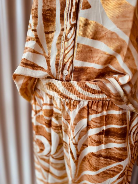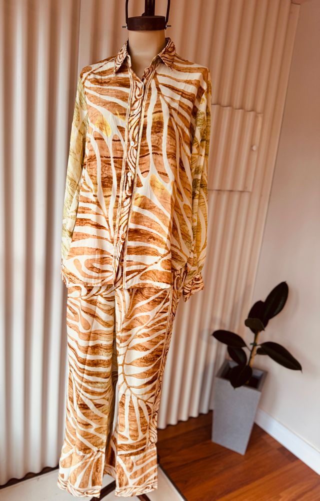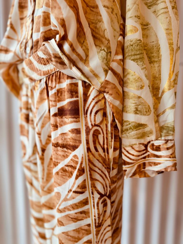 Pantalón amplio de seda tornasolada, de caída fluida y movimiento ligero. Está confeccionado en el mismo estampado en tonos tierra con detalles en foil dorado Ver más detalles
