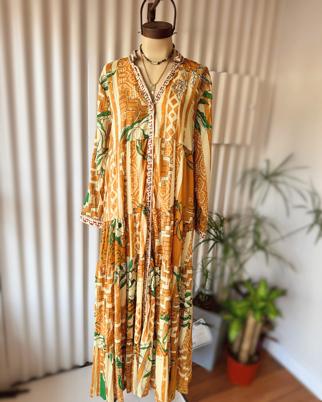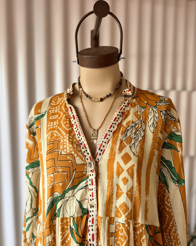 Un vestido largo 100% algodón, suave y fresco, ideal para usar en cualquier época del año. Su diseño camisero lo hace cómodo y fácil de combinar, perfecto para un look relajado con sandalias o más urbano con zapatillas.