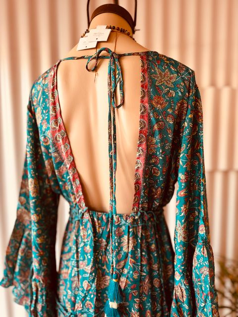 Vestido corto confeccionado en seda de la India, con un estampado botánico lleno de vida y delicados detalles dorados que realzan su diseño artesanal. Ver más detalles