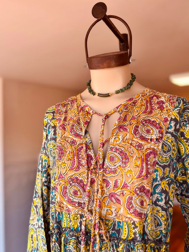 Vestido largo confeccionado en algodón de la India, ligero y súper cómodo, con un estampado colorido que transmite energía y frescura. Ver más detalles