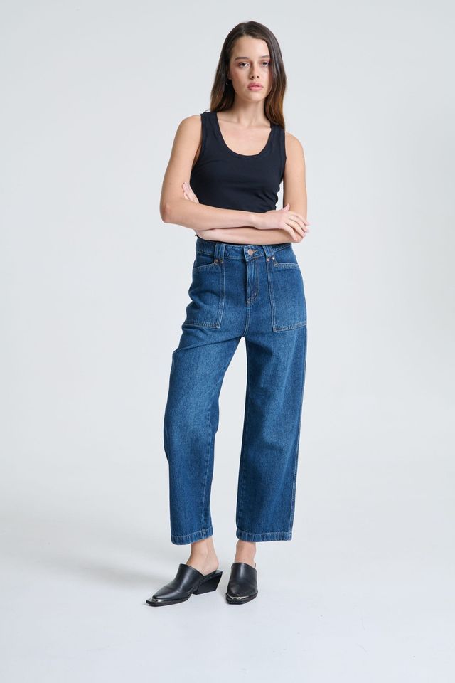La tela es rigida. Tiene el detalle de los bolsillos en el delantero y los pasacintos anchos, lo que hace la diferencia con un recto clasico. El lavado es azul oscuro. Si preferis que te quede mas relajado podes comprarte un talle mas, siempre chequeando la tabla de talles.